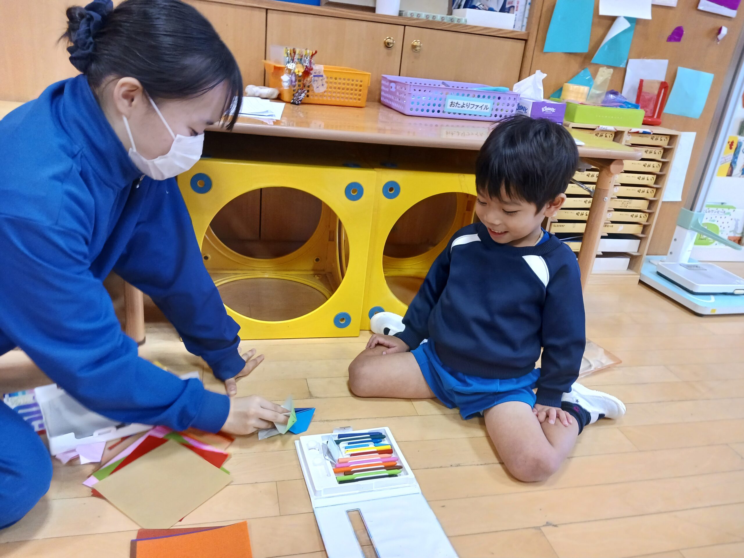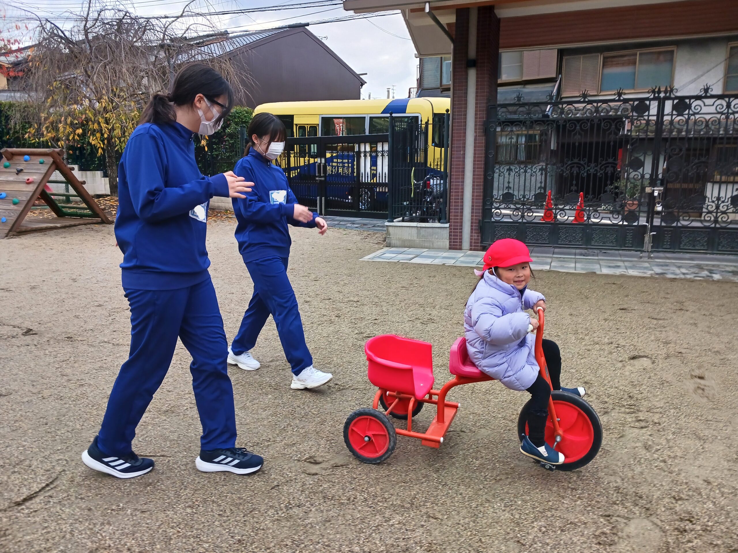 お姉さんたちが優しく声を掛けてくれたり、一緒に遊んでくれて、子どもたちもとても楽しそうでした♪一緒に砂場遊びや鬼ごっこ、絵本や折り紙を一緒にしたり、遊具や三輪車に仲良く乗ったりして笑顔いっぱいの素敵な時間を過ごすことが出来ましたね♡